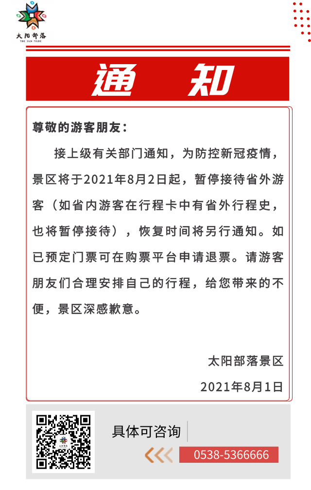 通知:為防控新冠疫情,太陽部落將于8月2日起暫停接待省外游客